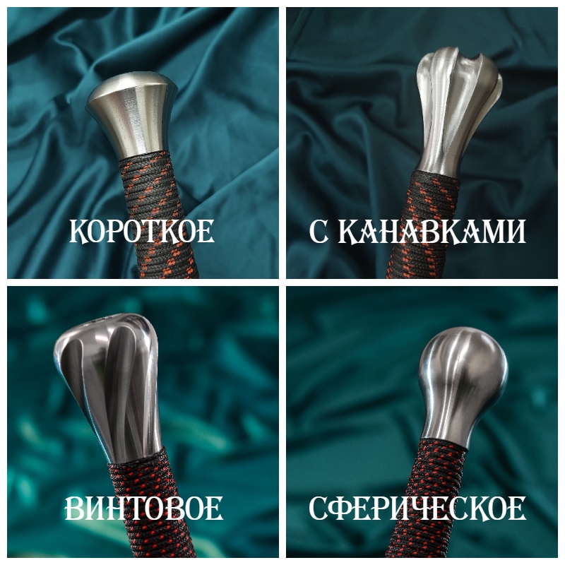 Закаленная гарда, прочный шнур на рукояти, навершие на специальной резьбе, закаленный клинок из ударопрочной рессорно-пружинной стали.